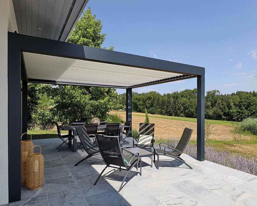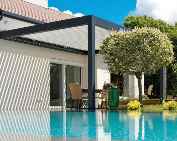 Avec ses lames orientables, la pergola bioclimatique joue avec les éléments naturels pour vous offrir fraîcheur, lumière et protection, selon vos envies.
